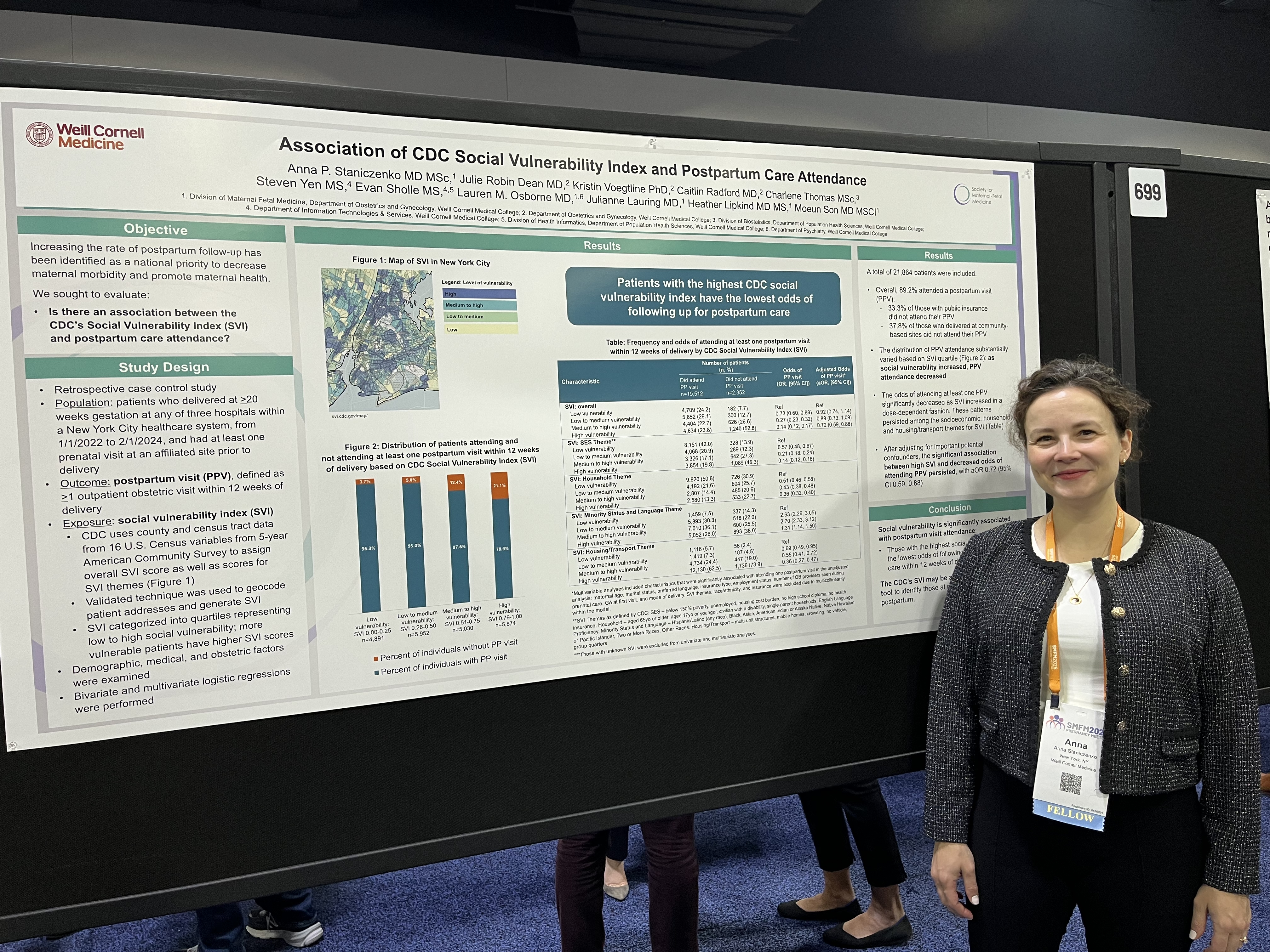 - Dean JR, Staniczenko AP, Voegtline K, Thomas C, Yen S, Sholle E, Osborne LM, Lipkind HS, Son M. Association of CDC Social Vulnerability Index and Adequate Prenatal Care. Poster at SMFM 45th Annual Pregnancy Meeting, Aurora, CO, January 2025.